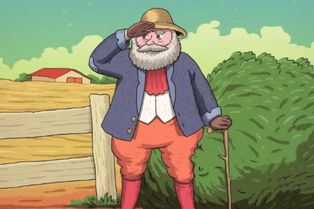 A imagem mostra um homem idoso com barba branca e cabelos grisalhos, usando um chapéu de palha, uma jaqueta azul escura, calças laranja e botas azuis. Ele está em pé ao lado de um cerca de madeira em um cenário rural, com campos dourados ao fundo e uma casa vermelha distante. O homem está levantando a mão à altura da testa, como se estivesse procurando algo à distância, com um bastão na outra mão. Você consegue encontrar a mulher escondida na imagem?