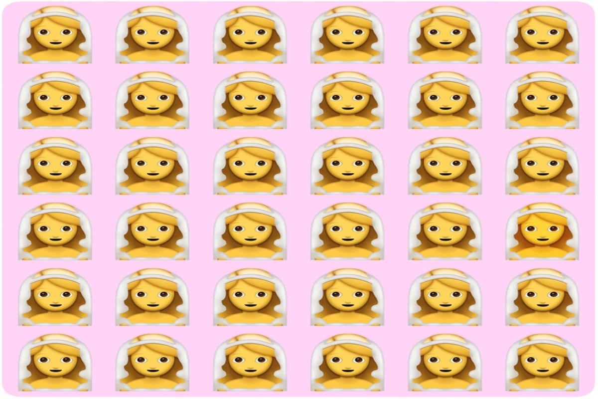 Desafio visual com diversos emojis de noivas organizados em linhas e uma delas apresenta visual diferente