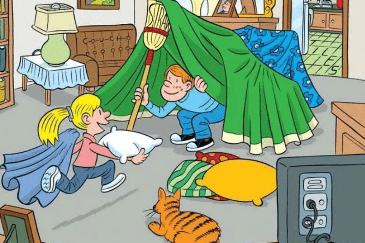 A imagem mostra uma cena animada e vibrante de uma sala de estar com diversos elementos espalhados. Duas crianças brincam alegremente, construindo um forte com cobertores apoiado em uma vassoura. Uma delas segura um travesseiro, enquanto a outra segura a estrutura do forte. Um gato laranja observa a brincadeira com curiosidade. Há almofadas espalhadas pelo chão, uma televisão na frente e uma mesa lateral com um abajur ao fundo.