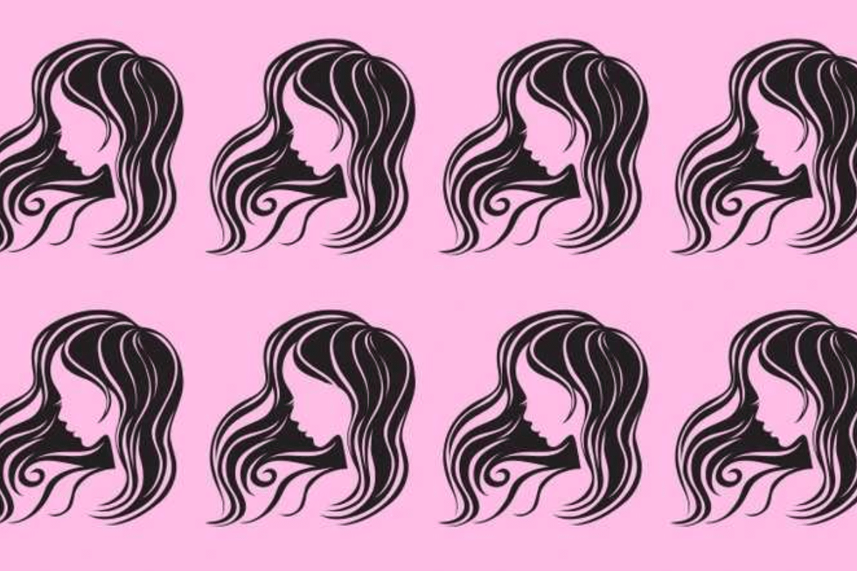 A imagem apresenta oito silhuetas idênticas de um rosto feminino de perfil, desenhadas com traços fluidos que formam o cabelo e os contornos do rosto. O fundo é rosa, o que destaca ainda mais os detalhes em preto da ilustração. No entanto, há um detalhe que diferencia uma dessas silhuetas das demais.