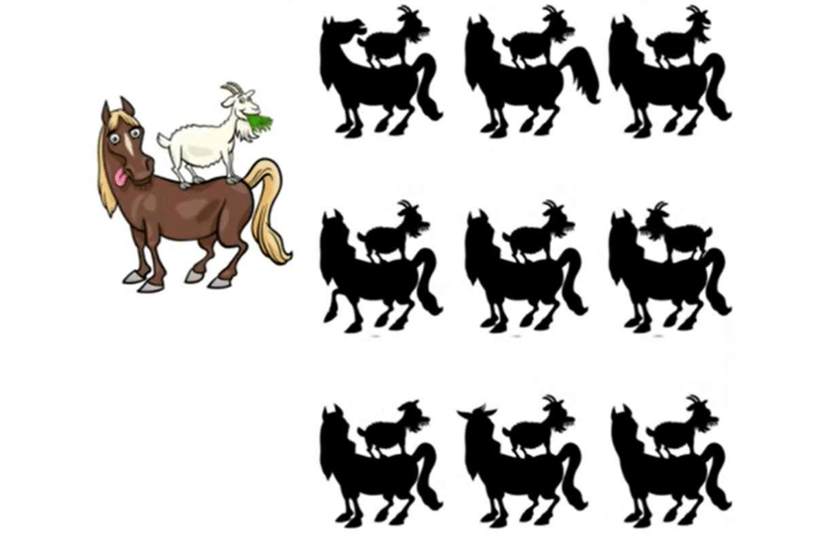 Ao lado dessa cena, há seis sombras diferentes que representam possíveis correspondências para a imagem original. Cada sombra tem pequenos detalhes distintos, como a posição da cauda do cavalo, o formato da cabeça da cabra ou a postura dos animais.