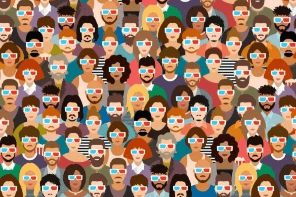 A imagem mostra uma multidão de pessoas assistindo a um filme em um cinema. Todos estão usando óculos 3D vermelho e azul, criando um efeito visual chamativo. A ilustração é detalhada, com diferentes estilos de cabelo, roupas e expressões, tornando a cena movimentada e interessante.