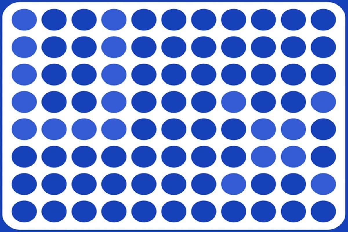 Prepare-se para o desafio de hoje, que vai testar sua percepção! A imagem mostra um padrão uniforme composto por círculos azuis em dois tons distintos, organizados em linhas e colunas regulares sobre um fundo branco com bordas arredondadas.