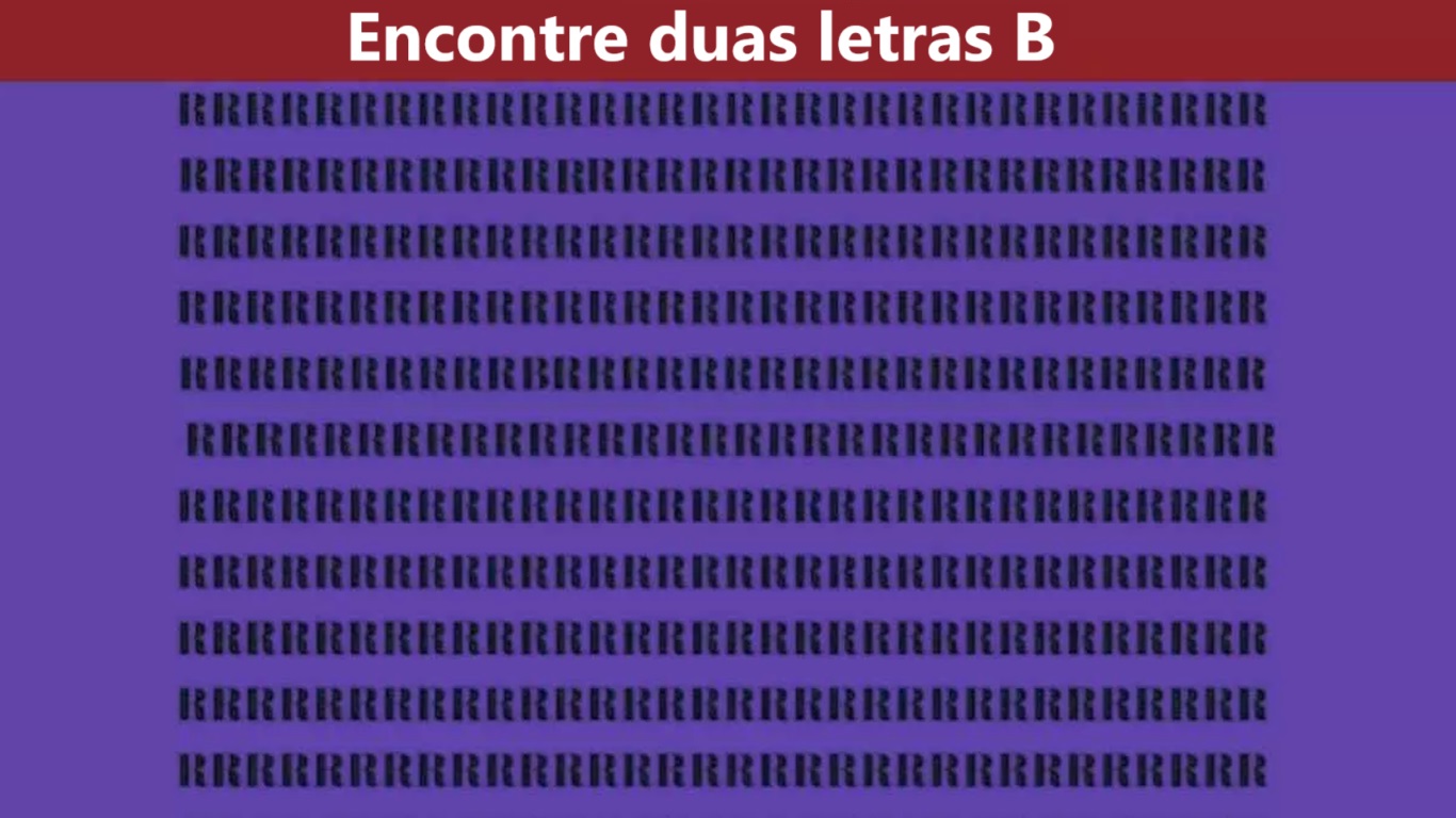 Com apenas 8 segundos para encontrar as duas letras B escondidas em meio a uma imagem repleta de letras R, este desafio visual coloca suas habilidades de percepção à prova. A ilusão de ótica criada pela repetição das letras R torna a tarefa ainda mais complexa, exigindo uma atenção meticulosa e uma rápida varredura visual. Identificar as letras B em um mar de Rs testa não só sua capacidade de focar em detalhes minuciosos, mas também sua agilidade em discernir padrões e diferenças sutis. Este exercício é perfeito para quem gosta de desafios visuais intensos e quer aprimorar suas habilidades de observação sob pressão. Boa sorte e divirta-se com esta emocionante corrida contra o relógio!