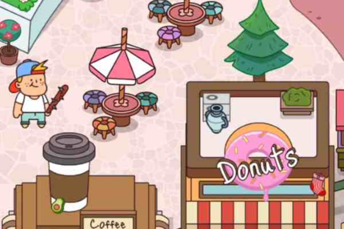 Mais abaixo, há uma loja de donuts com uma vitrine chamativa e, ao lado, um grande copo de café estilizado. Um pequeno personagem, com roupas descontraídas, segura um item enquanto explora o espaço. A cena também inclui elementos como flores, vasos decorativos e outras características urbanas, o que adiciona riqueza de detalhes ao ambiente.