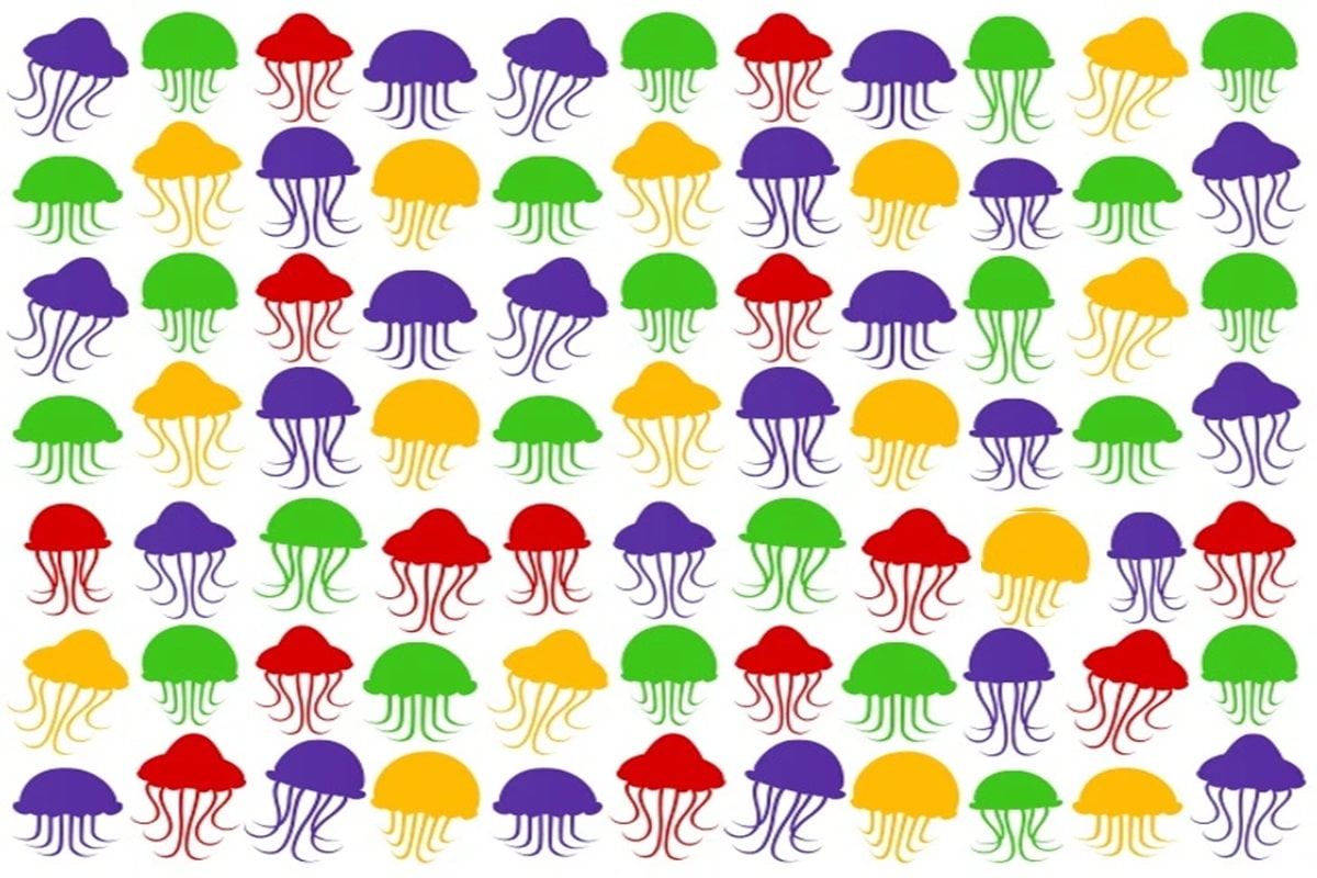 Prepare-se para o desafio de hoje, que vai testar sua percepção! Observe com bastante atenção, a imagem composta por um padrão repetitivo de águas-vivas em cores variadas como vermelho, verde, amarelo e roxo.