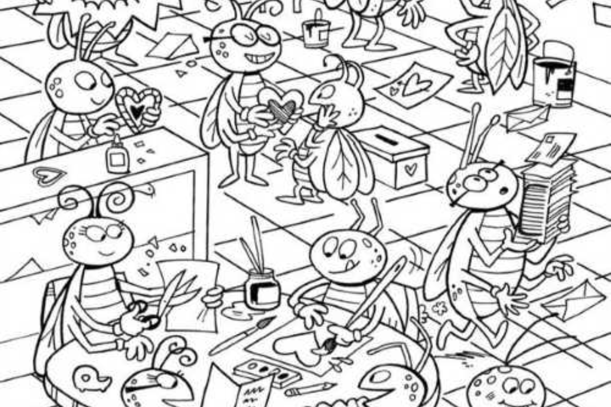 A imagem apresenta um cenário divertido e cheio de detalhes, onde várias formigas estão envolvidas em atividades criativas dentro de uma sala. Elas parecem estar desenhando, cortando papéis em formatos de coração, empilhando objetos e interagindo umas com as outras. O espaço está repleto de itens como tesouras, papéis, pincéis, copos e até um vaso decorado, criando uma atmosfera movimentada e caótica.