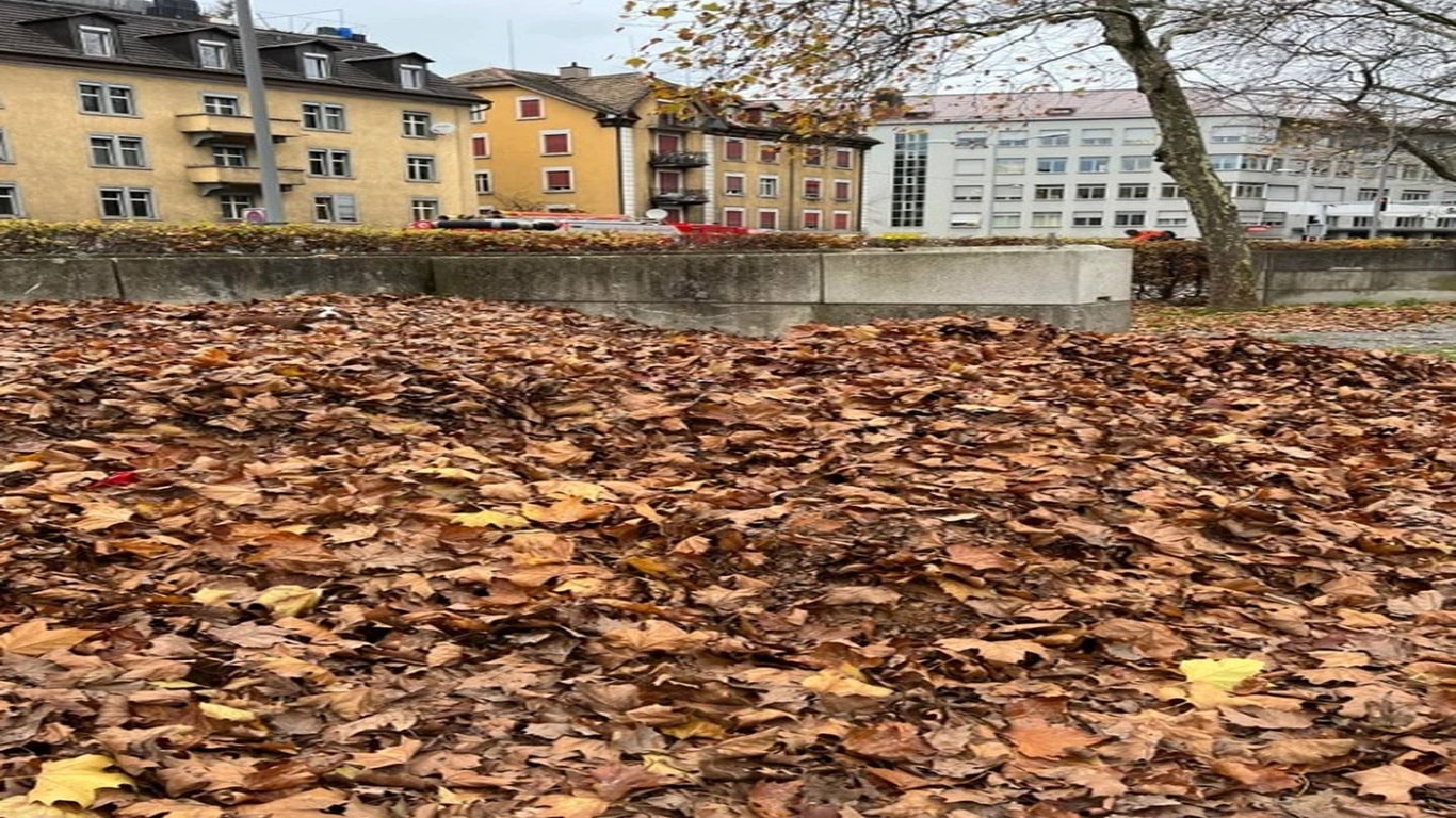 Um cachorro brincando e quase invisível em meio a um grande monte de folhas caídas, com prédios ao fundo. Imagem: reddit