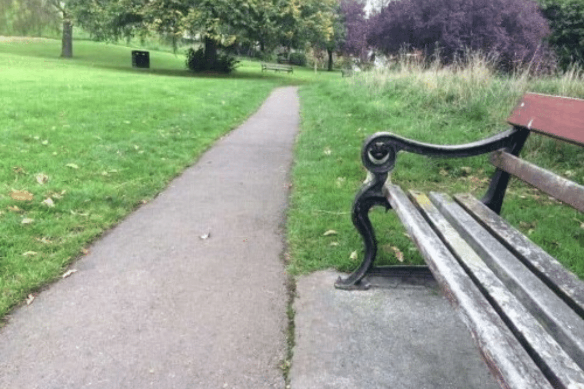 A imagem mostra um parque com um caminho pavimentado que se estende em linha reta, ladeado por grama verde e árvores ao fundo. No canto direito, há um banco de madeira com estrutura metálica, parcialmente cortado pela borda da foto. A cena parece tranquila, mas esconde um desafio visual intrigante.