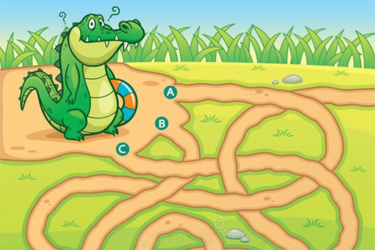 O objetivo é guiar o crocodilo através do labirinto até o lago. No entanto, o caminho é emaranhado e só um verdadeiro detetive consegue encontrar a saída correta. A partir do ponto onde o crocodilo está, você precisa escolher o caminho certo entre as opções A, B ou C.