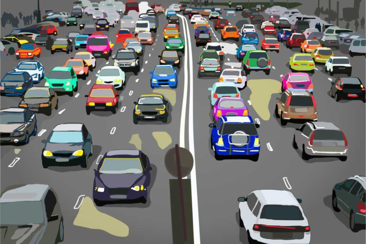 A imagem apresenta uma rodovia congestionada com uma grande quantidade de carros coloridos, variando entre tons de azul, rosa, verde, vermelho, e outras cores. A cena retrata uma visão aérea do tráfego em várias faixas, com veículos se movendo em ambas as direções. Cada carro parece estar em movimento, o que contribui para a complexidade da imagem.