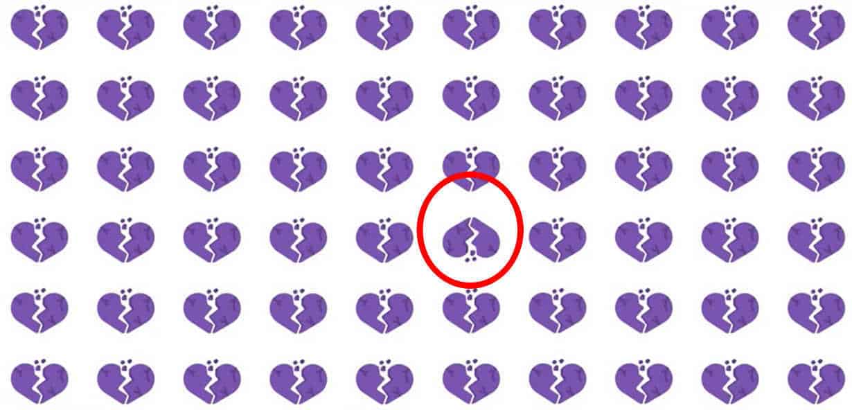 A imagem mostra uma grade composta por vários corações quebrados na cor roxa. Cada coração parece idêntico à primeira vista, mas entre eles, um é ligeiramente diferente. Sua tarefa é identificar qual coração se destaca dos outros.