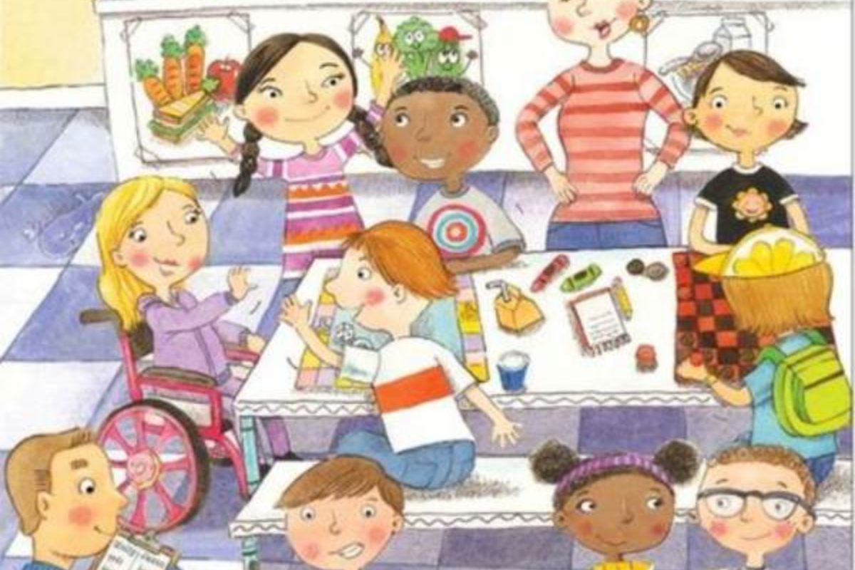 A imagem mostra uma cena colorida e vibrante de crianças em um ambiente escolar, possivelmente uma lanchonete ou refeitório. As crianças estão sentadas em mesas interagindo entre si, com jogos, cadernos e lanches espalhados ao redor. Ao fundo, há uma bancada com frutas e vegetais decorando o cenário, enquanto um adulto, possivelmente um professor, observa e participa da interação com os alunos.
