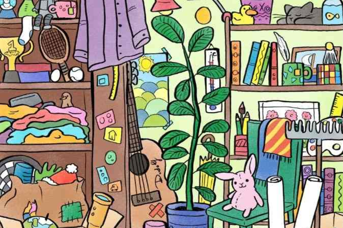 A imagem retrata um quarto repleto de objetos diversos, como móveis, plantas, roupas e brinquedos, todos distribuídos de maneira aparentemente caótica. Entre os itens espalhados, há um elefante camuflado, esperando para ser descoberto.