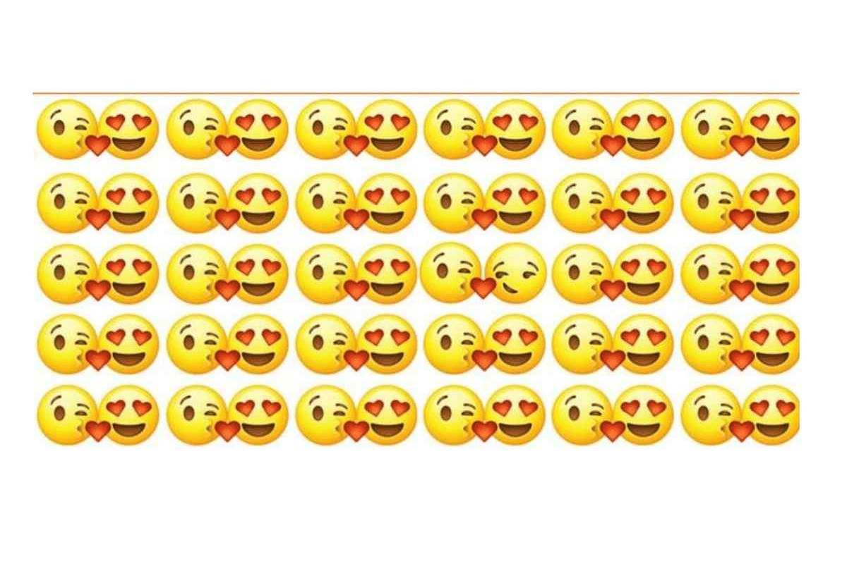 Todos os pares têm um coração vermelho no emoji do beijo. Observe se algum deles está com formato ou posição diferente.