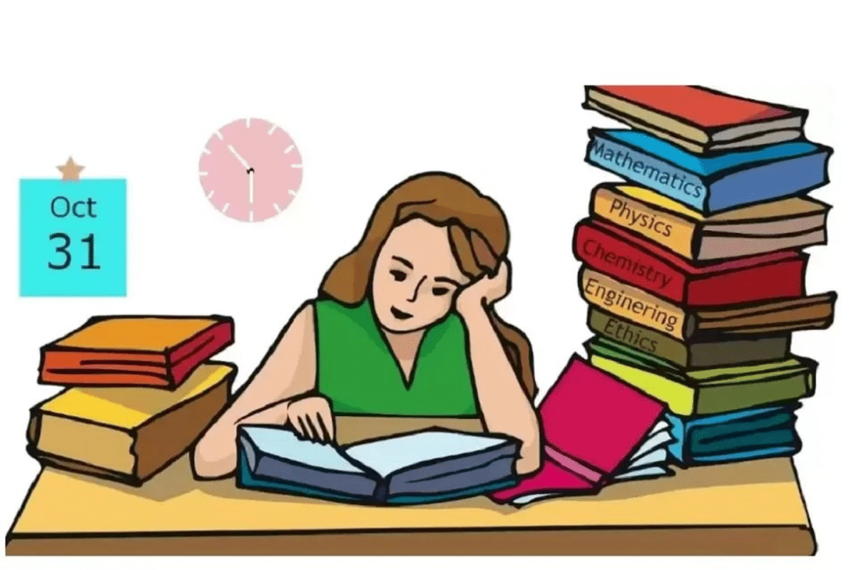 A imagem mostra uma jovem estudante concentrada em sua leitura, rodeada por uma grande pilha de livros. Entre os títulos, podem ser vistos temas como Matemática, Física, Química, Engenharia e Ética. Sobre a mesa, há mais livros espalhados, alguns abertos e outros empilhados.