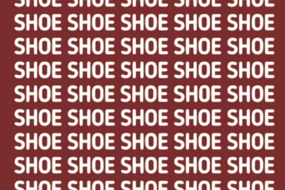 Na imagem, vemos uma grade repleta de palavras “SHOE” organizadas em várias linhas e colunas sobre um fundo vermelho. Embora todas as palavras pareçam idênticas à primeira vista, há uma diferença sutil: uma das palavras está grafada de forma incorreta.