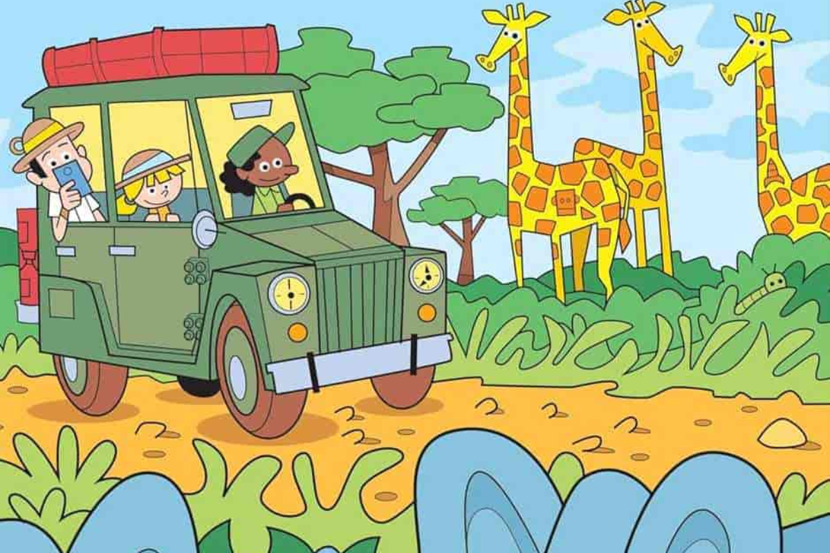 Neste desafio visual, vemos uma cena animada de um safári na selva. Um jipe verde com três personagens está à esquerda, sendo dirigido por uma pessoa de chapéu verde. Dois outros passageiros, um de chapéu amarelo e outro que parece estar tirando fotos, estão na parte de trás do jipe. Ao fundo, três girafas com manchas laranja estão em pé, observando calmamente a cena. No primeiro plano, há três elefantes azuis, sendo um deles um filhote. A vegetação ao redor é composta de grandes arbustos verdes, e há árvores ao fundo, compondo o cenário típico de uma savana.