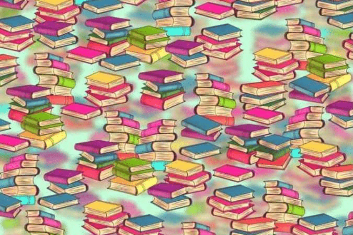 A imagem apresenta uma ilustração vibrante e caótica de várias pilhas de livros coloridos, dispostas de maneira aparentemente aleatória sobre um fundo com cores em tons suaves e difusos. Cada pilha tem formatos e posições diferentes, com livros empilhados de todos os jeitos, criando um verdadeiro desafio visual.