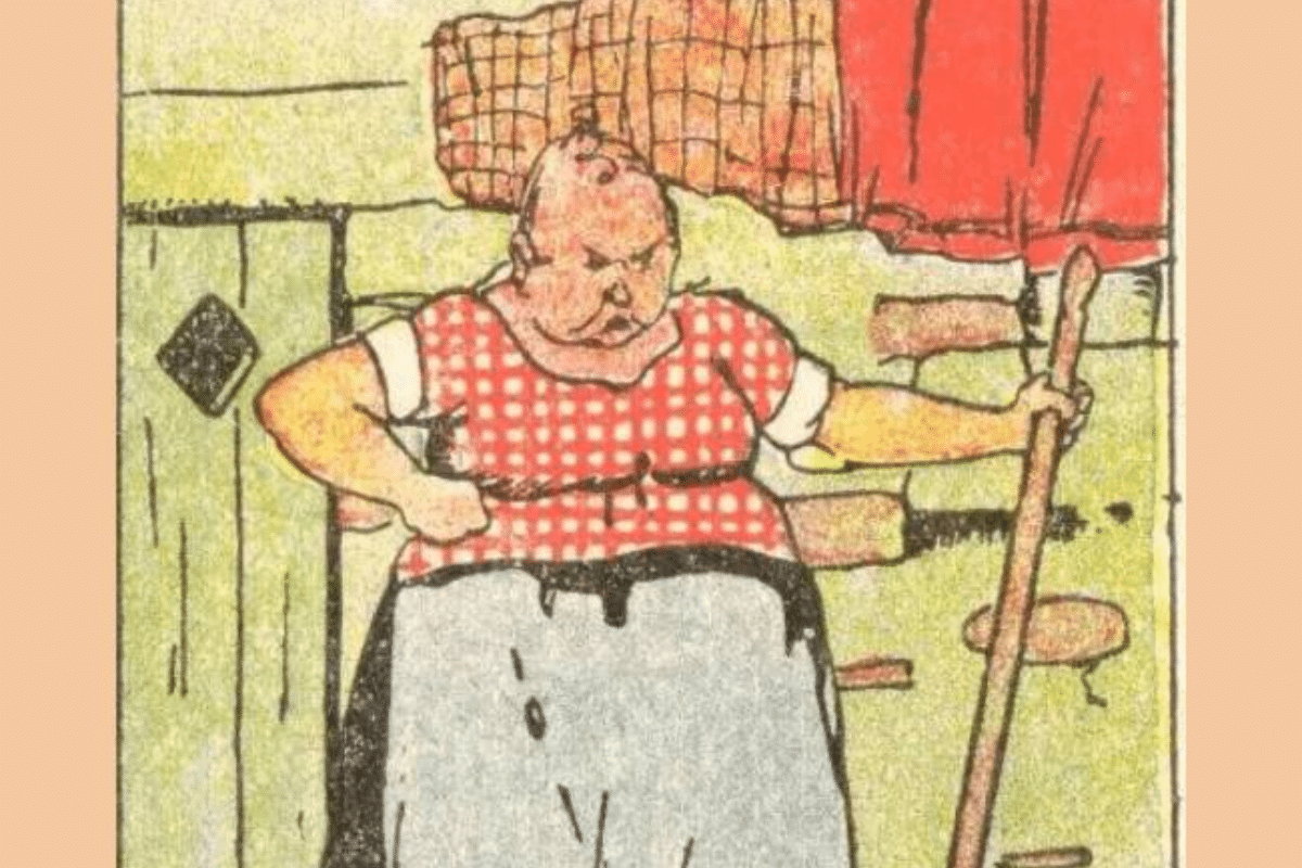 Na imagem, vemos uma senhora idosa em pé, dentro de casa, segurando uma vassoura. Ela veste uma blusa vermelha com estampa xadrez branca e uma saia longa azul clara. Ao seu lado, há um balde e uma parede com tijolos aparentes. O cenário é simples, típico de um ambiente doméstico antigo.