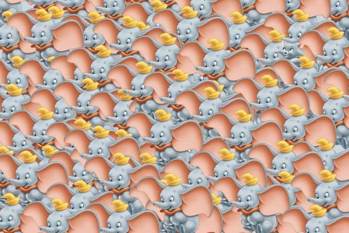 A imagem apresenta um padrão repetitivo de pequenos elefantes com grandes orelhas cor-de-rosa e chapéus amarelos. Eles estão dispostos de forma organizada, tornando a cena visualmente complexa. No entanto, há um detalhe escondido que desafia sua percepção: um gato chamado Berlioz está camuflado entre os elefantes.