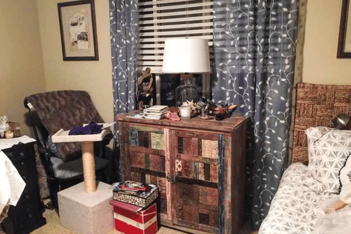 A imagem retrata um quarto aconchegante, decorado com móveis rústicos e diversos objetos espalhados pelo ambiente. No centro, há um armário de madeira colorida sobre o qual repousam livros, sapatos e pequenas decorações. Acima dele, uma luminária branca ilumina o espaço. Ao fundo, cortinas estampadas cobrem a janela, adicionando um toque de suavidade ao cenário.
