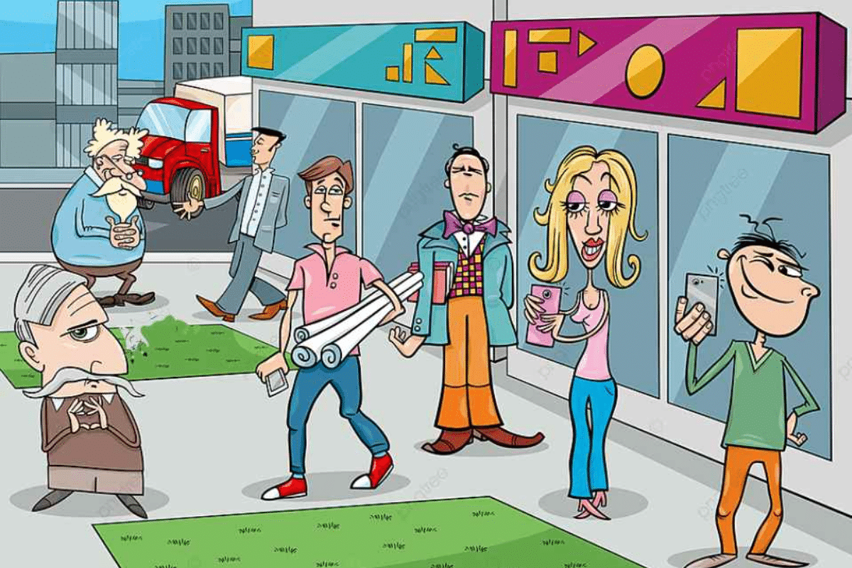 A imagem mostra uma cena urbana movimentada, com diversas pessoas interagindo ou distraídas. À esquerda, vemos um senhor de terno fumando, um idoso de bigode próximo a um caminhão vermelho, e mais ao centro, homens carregando rolos de papel e usando o celular. Do lado direito, em frente a uma vitrine com letreiros coloridos, uma mulher loira segura o telefone, acompanhada de dois outros homens — um deles também tira uma selfie.