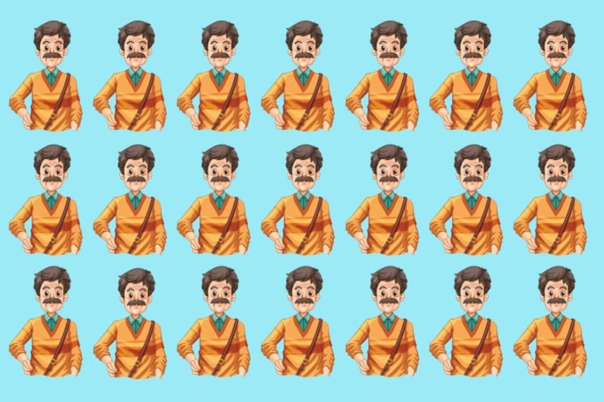 Prepare-se para o desafio de hoje, que foi projetado para avaliar sua percepção. A imagem apresenta um personagem masculino de desenho animado, com bigode, cabelo castanho e suéter laranja, repetido várias vezes em linhas sobre um fundo azul.