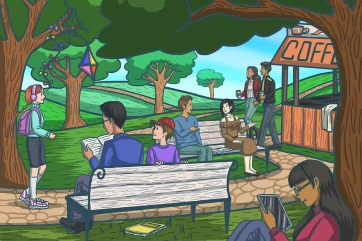 A imagem apresenta uma cena de parque aparentemente comum, mas um detalhe foi camuflado: um jornal está escondido em algum lugar. Sua tarefa neste desafio visual é simples, mas exige atenção aos detalhes: encontre o jornal antes que o tempo acabe. Esse tipo de teste estimula o raciocínio lógico, aprimora a observação e melhora a concentração.