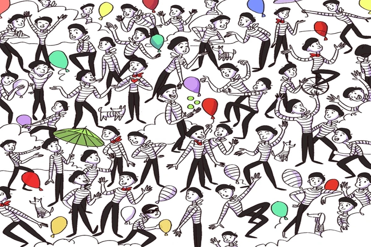 Prepare-se para o desafio de hoje, que vai testar sua percepção! Observe com bastante atenção, a imagem mostra uma ilustração composta por vários mímicos com balões coloridos e expressões alegres em fundo branco. Você consegue achar o ladrãozinho camuflado entre os mímicos em até 15 segundos?