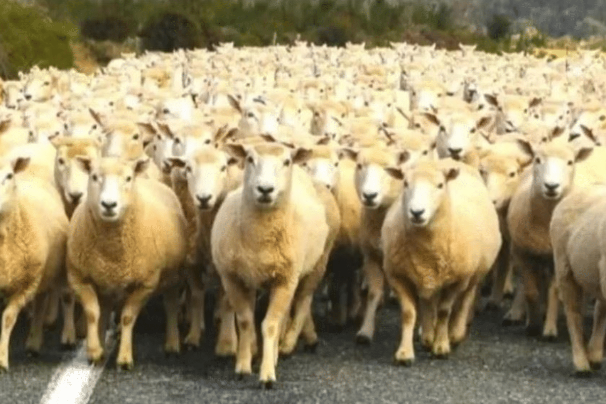 A imagem apresenta um enorme rebanho de ovelhas caminhando juntas em uma estrada. À primeira vista, parece uma cena comum de pastoreio, mas há um detalhe curioso: um lobo está escondido entre as ovelhas. Ele se disfarça no meio do grupo, tentando passar despercebido.