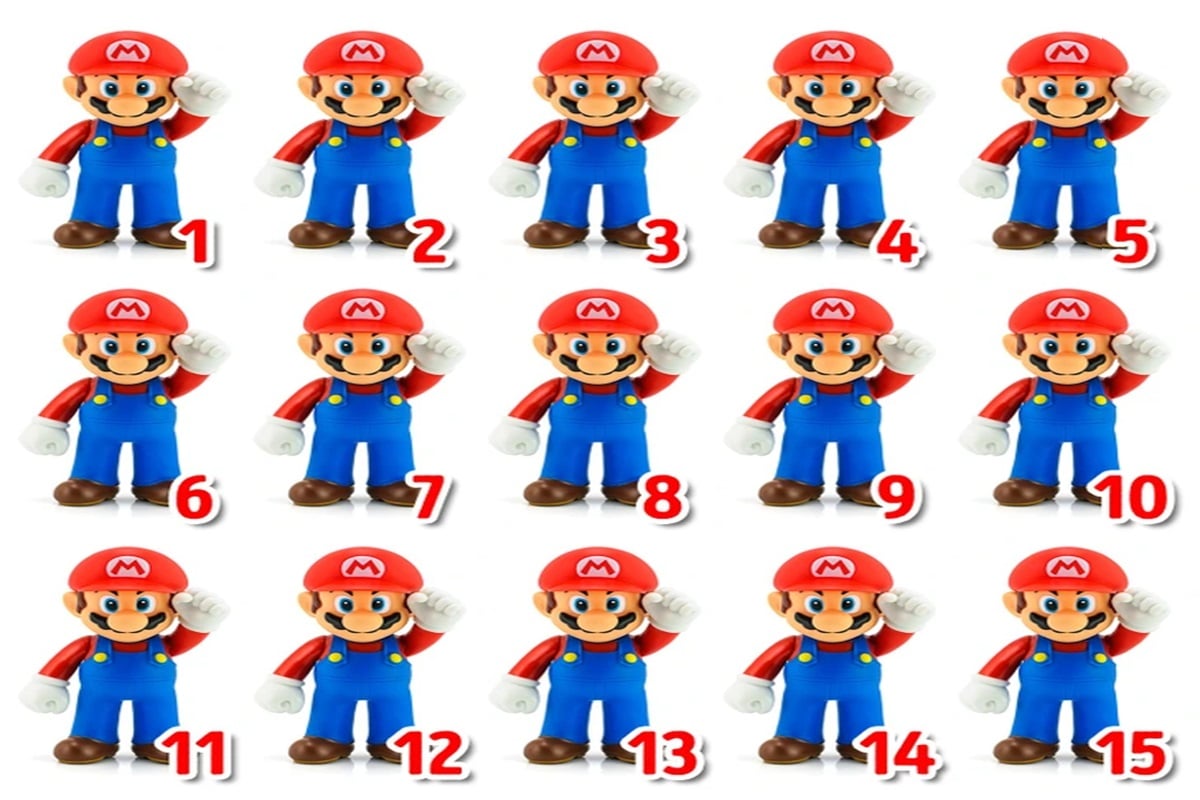 Prepare-se para o desafio de hoje, que vai testar sua percepção! Analise a imagem que mostra quinze figuras do personagem Mario, cada uma numerada de 1 a 15, com uma diferença a ser encontrada. Será que você consegue encontrar o único Mario fora do padrão nesta imagem em até 20 segundos?