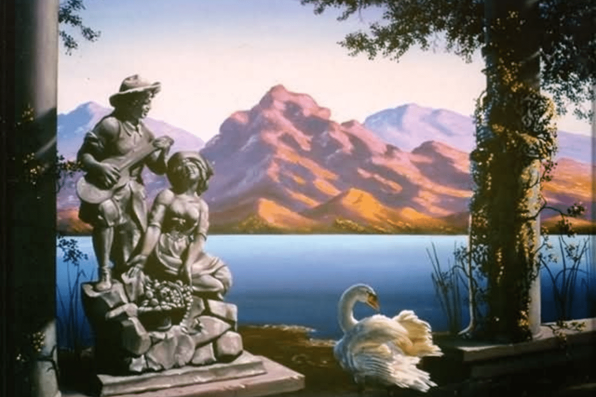 A imagem apresenta uma bela paisagem à beira de um lago, com montanhas ao fundo refletindo a luz do sol. Em primeiro plano, há uma escultura de um casal: um homem segurando um instrumento musical e uma mulher sentada ao lado de uma cesta de frutas. Um cisne repousa próximo a uma coluna adornada com trepadeiras, acrescentando um toque de serenidade à cena.