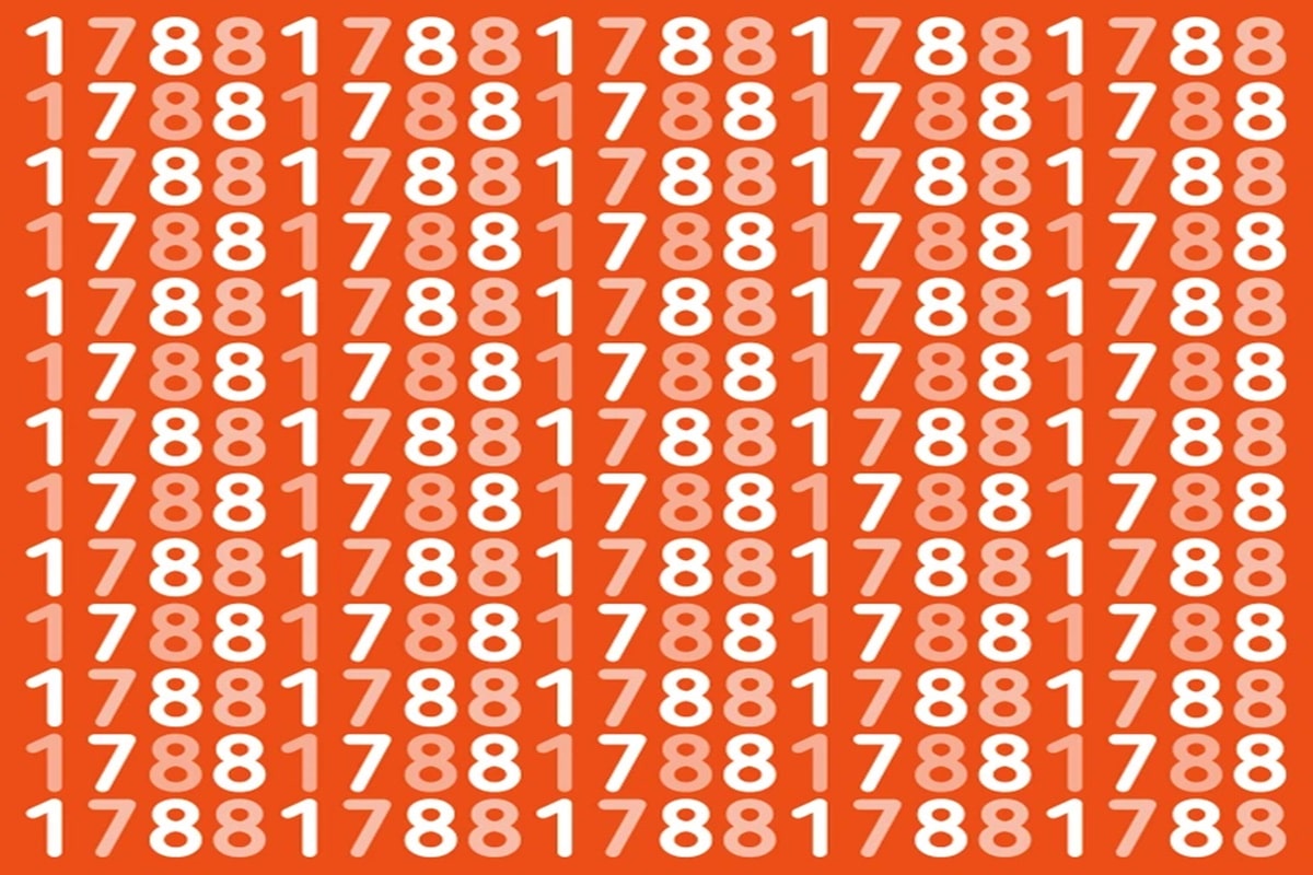 Prepare-se para o desafio de hoje, que vai testar sua percepção! Observe: a imagem que mostra uma repetição contínua do número 1788 em branco sobre um fundo laranja. Entre os números iguais, há um número 1785 camuflado. O objetivo é encontrar esse número diferente, treinando a concentração e a percepção visual.