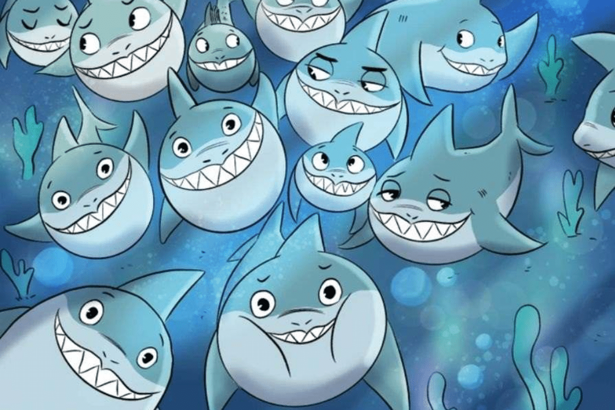 Na imagem, um grupo de tubarões de desenho animado nada por um cenário subaquático, todos com sorrisos largos e dentes afiados. O fundo é de um azul profundo, com algumas plantas aquáticas flutuando. Entre todos esses tubarões, há um pequeno peixe disfarçado, que se camufla de forma inteligente, tornando-se difícil de encontrar.