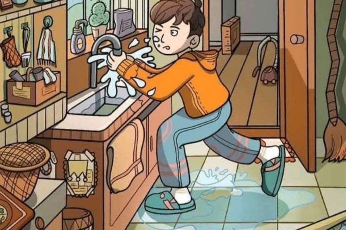 A imagem mostra uma cozinha bastante desorganizada, com diversos objetos espalhados pelo ambiente. No centro da cena, uma criança tenta controlar a água da torneira, que está transbordando. O chão está molhado, aumentando o caos do ambiente. Há itens fora do lugar, como um tijolo no chão, um relógio sem ponteiros e uma vassoura inclinada contra a parede.
