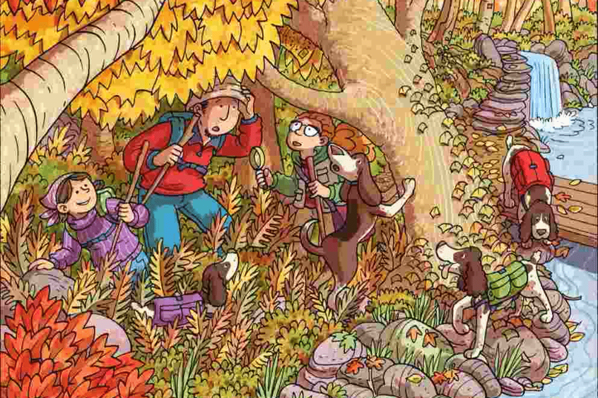 A imagem retrata um grupo de exploradores em uma floresta durante o outono. Árvores com folhas alaranjadas e amarelas criam um cenário vibrante, enquanto um rio de águas calmas atravessa a paisagem. Entre os aventureiros, há crianças e cães equipados com mochilas, bastões de caminhada e lupas, aparentemente à procura de algo.