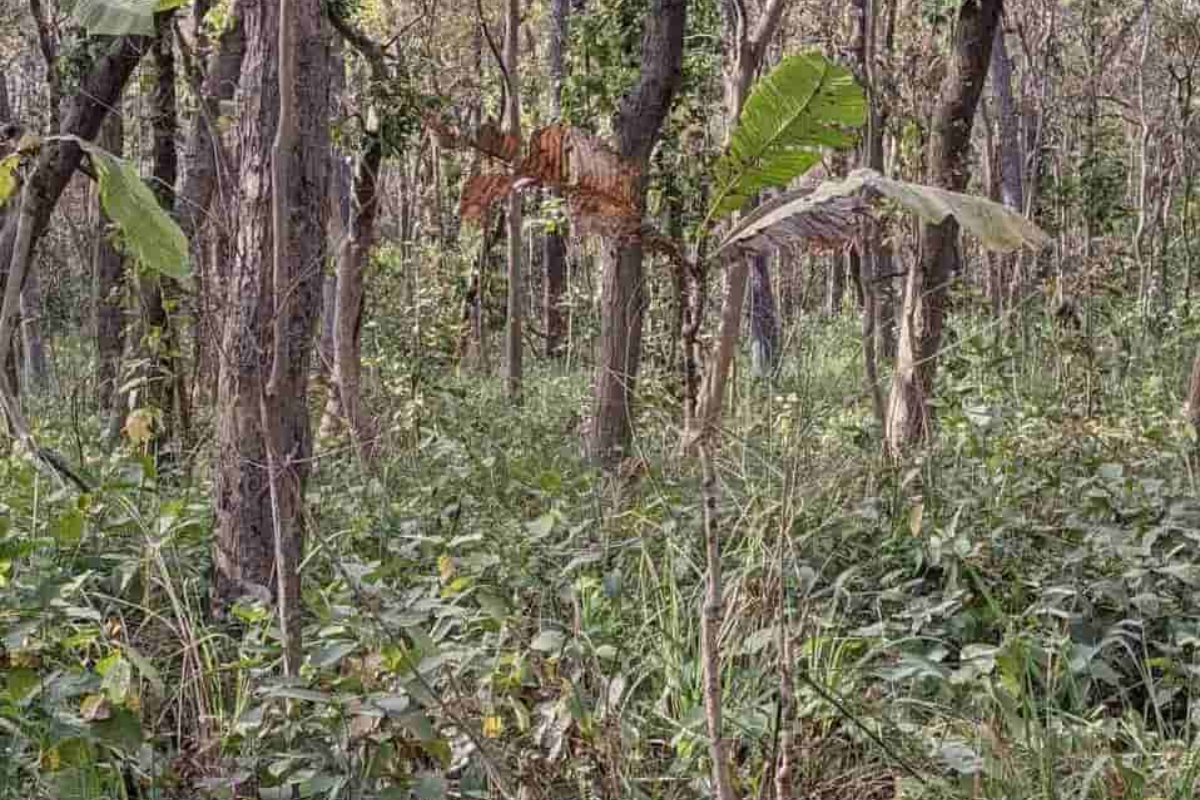 A imagem apresenta uma densa floresta, cheia de árvores altas, vegetação baixa e folhas espalhadas pelo solo. A selva parece estar em um ambiente tropical, com uma mistura de luz e sombras projetadas pelas copas das árvores. O verde predomina, e a paisagem natural parece ser calma e silenciosa. No entanto, nesta cena aparentemente pacífica, há um desafio visual escondido: um tigre está camuflado entre as árvores.
