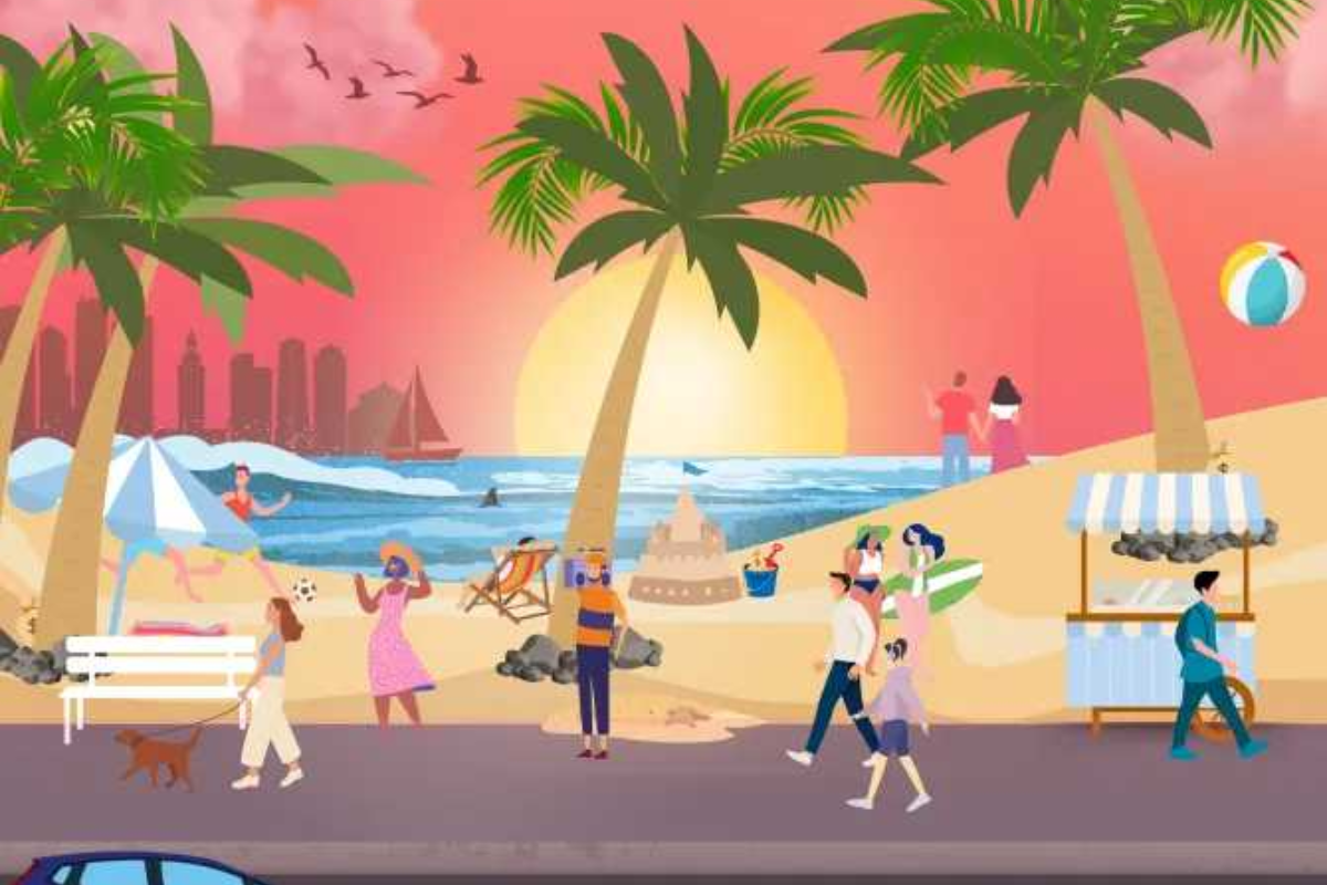 A imagem retrata um cenário vibrante de uma praia ao pôr do sol. Palhas de coqueiros balançam ao vento enquanto pessoas aproveitam o ambiente descontraído. No fundo, há barcos navegando no mar, um castelo de areia na areia dourada e várias atividades, como pessoas caminhando, passeando com cães e aproveitando o dia ensolarado.