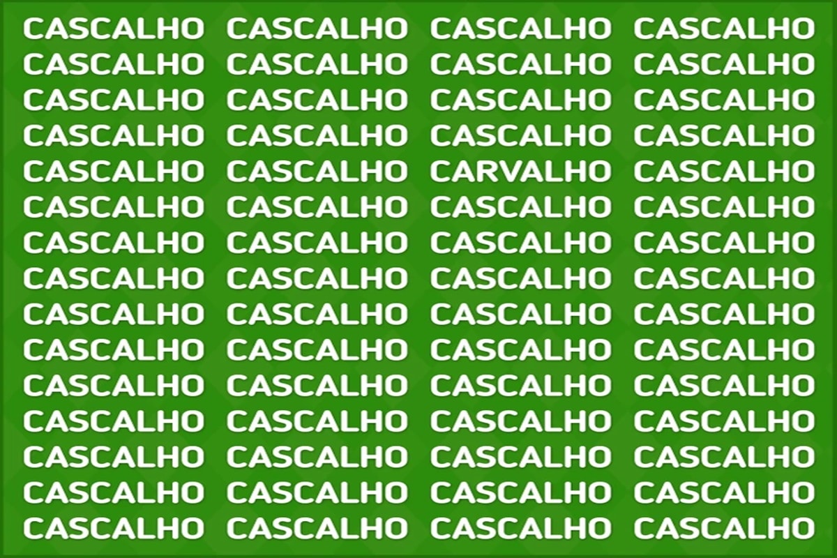Desafio visual com várias palavras “cascalho” e uma “carvalho” em fundo verde