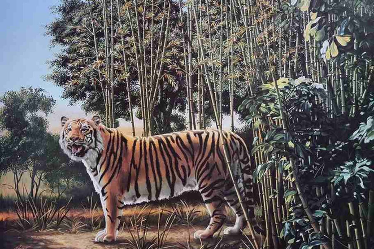 A imagem retrata uma paisagem natural rica em detalhes, com vegetação densa, incluindo árvores, arbustos e bambus que preenchem a cena. Em primeiro plano, há um tigre claramente visível, com suas listras características, mas o desafio é encontrar outro tigre camuflado entre a vegetação.
