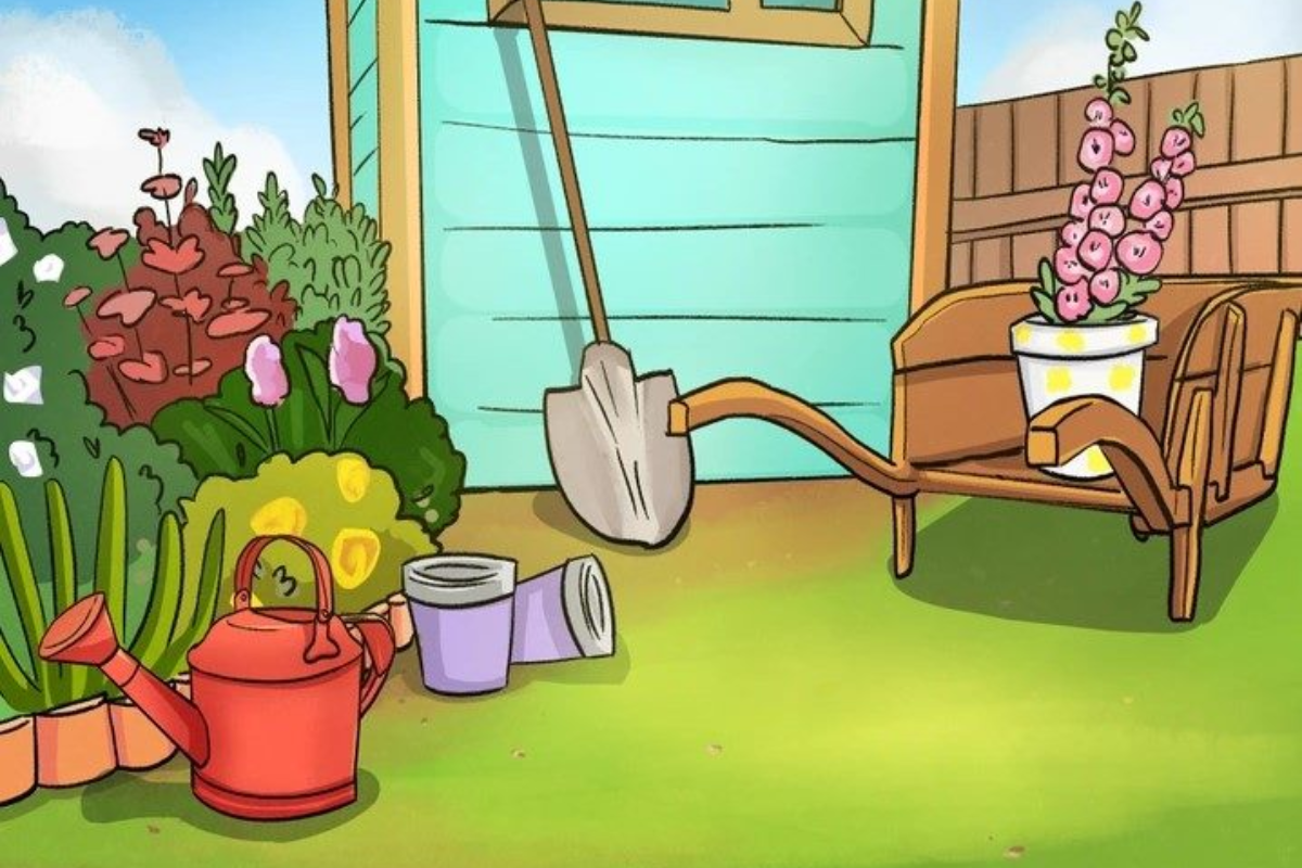 1. Observe os objetos de jardinagem: Algo entre as ferramentas usadas para cuidar do jardim parece não estar funcionando corretamente.