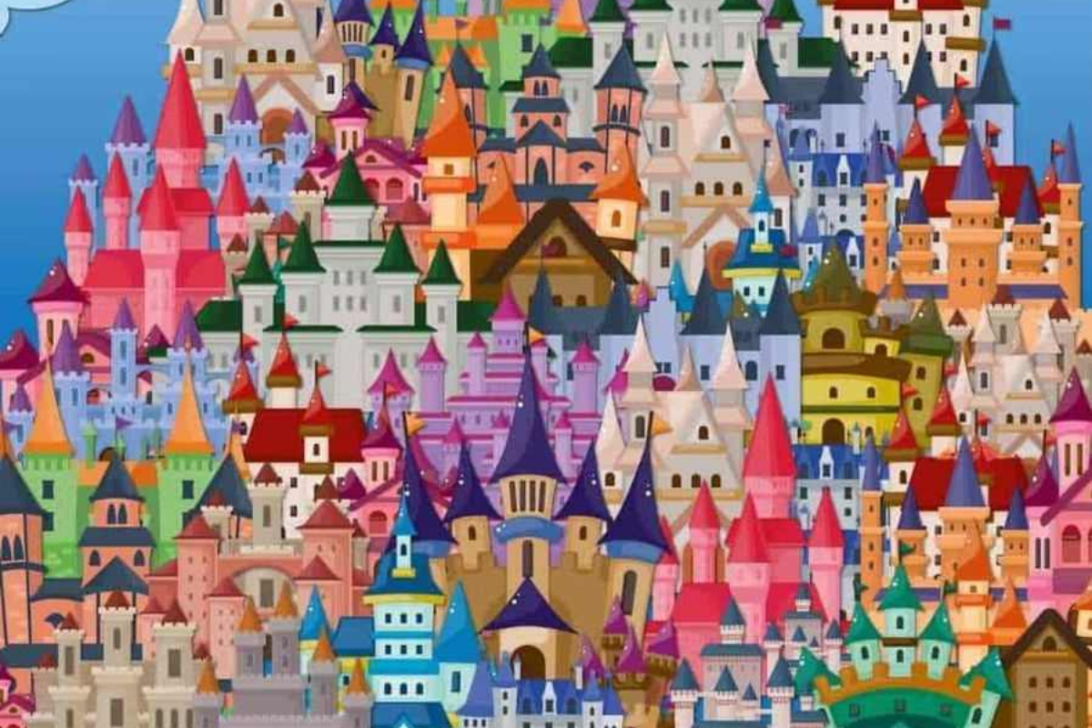 Agora, o desafio está lançado: encontrar o dragão escondido entre esses castelos! O dragão está camuflado de maneira inteligente entre as torres e detalhes dos castelos, tornando a tarefa mais desafiadora. Será que você consegue encontrá-lo em menos de 5 segundos?