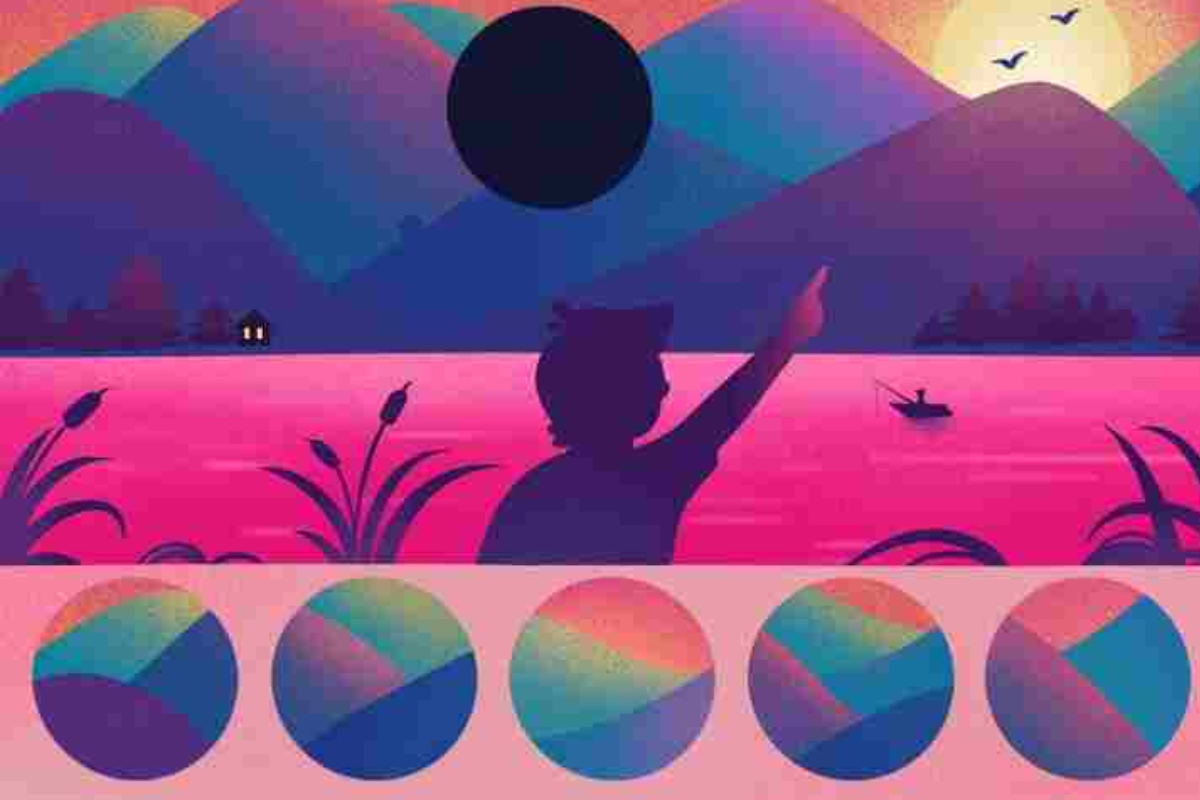 A imagem mostra um cenário vibrante de pôr do sol com montanhas ao fundo e um lago em tons de roxo e rosa. No centro da cena, uma figura aponta para o céu, onde há um círculo preto cobrindo parte da paisagem, como se uma peça estivesse faltando para completar a imagem.