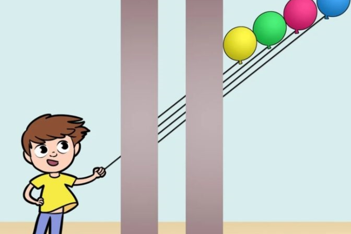 1. Observe o ângulo das cordas: Preste atenção na direção que cada corda segue a partir da mão do menino. A forma como elas se inclinam pode dar uma pista de qual balão está realmente ligado à mão dele.