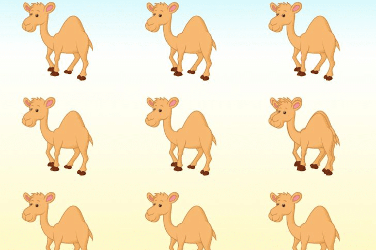 3. Verifique se há camelos a mais ou a menos: Todos os camelos devem ter a mesma aparência básica, mas um pode ser um pouco mais afastado ou virado de forma diferente.