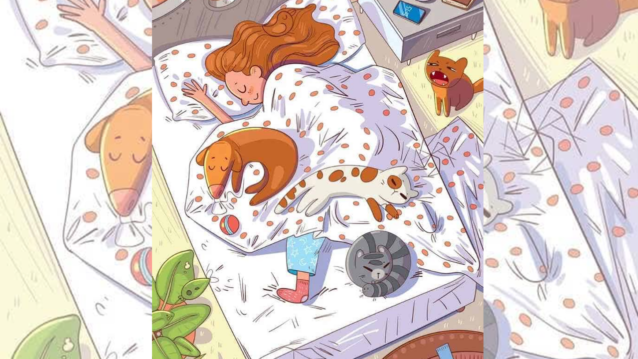 Na imagem apresentada acima, podemos contemplar uma cena natural, onde uma menina é vista de cima dormindo em seu quarto com seus animais de estimação ao redor. No entanto, existe uma ave também no quarto, você foi capaz de encontrá-la?