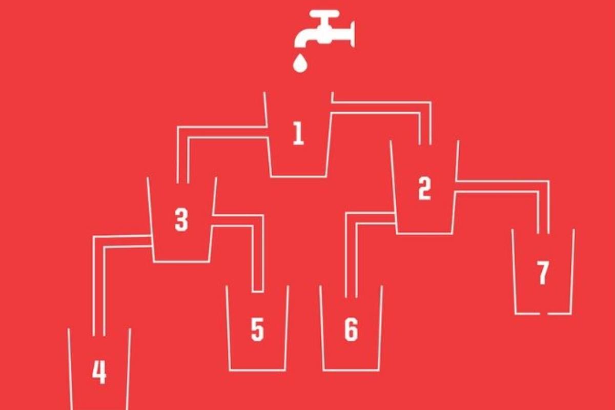A imagem apresenta um enigma visual onde sete copos numerados de 1 a 7 estão conectados por uma série de canos. No topo, há uma torneira aberta, sugerindo que a água irá fluir através dos canos para preencher os copos. A configuração dos canos entre os copos cria um desafio intrigante: determinar qual copo será o primeiro a encher.