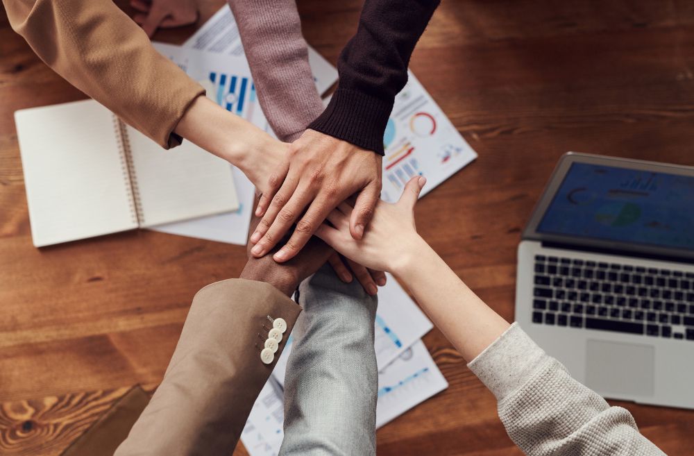 Pessoas unindo as mãos simbolizando trabalho em equipe para concurso da prefeitura.