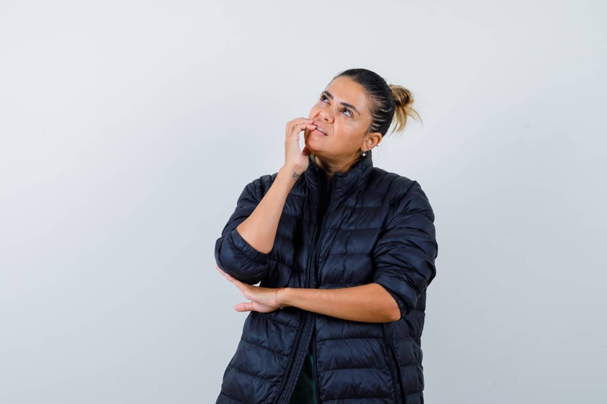 Mulher pensando sobre dúvidas de português, como ascensão ou ascenção